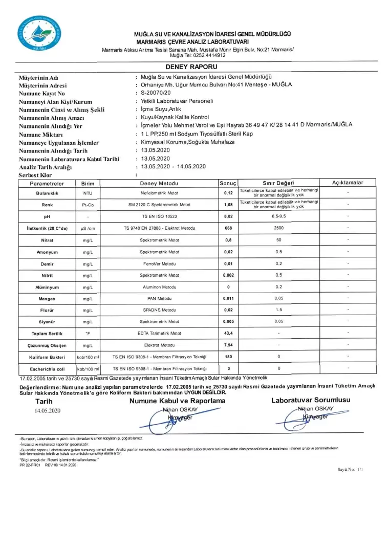 Konuyla ilgili hazırlanan yazılı açıklamaya göre, Belediye, Marmaris’teki kaynak sularından 14 Mayıs 2020 tarihinde alınan numuneleri analiz ettirdi. Bugün kamuoyuyla paylaşılan analiz sonuçlarında,  eski ismi “Sekine Evren” olan Armutalan’daki Soğucak çeşmesi için  “Numune analizi yapılan parametrelerde 17.02.2005 tarih ve 25730 sayılı Resmi Gazete’de yayımlanan İnsani Tüketim Amaçlı Sular Hakkında Yönetmelik’e göre PH bakımından uygun değildir” denildi.