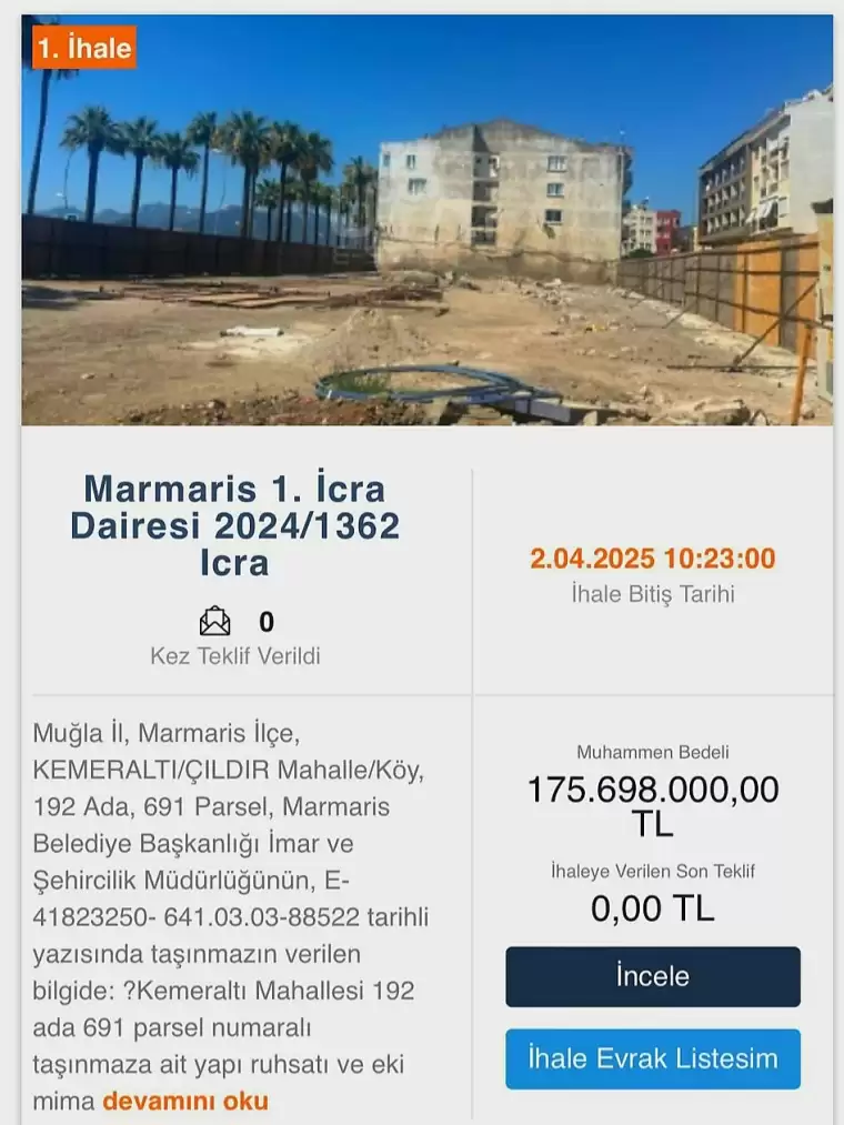Bu süreçte Marmaris Belediyesi’nin eski hizmet binasının bulunduğu arsa ile ilgili önemli bir gelişme yaşandı. Hatırlanacağı üzere, 2024 yılında söz konusu alanın 25 yıllığına kiraya verildiği ancak yapılan kaçak inşaat nedeniyle Marmaris Belediyesi İmar ve Şehircilik Müdürlüğü ekipleri tarafından mühürlendiği kamuoyuna yansımıştı. Şimdi ise bu alan, Marmaris 1. İcra Müdürlüğü tarafından satışa çıkarılıyor.